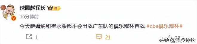 根據(jù)媒體人“球圈趙探長(zhǎng)”報(bào)道,今天薩姆納和崔永熙都不會(huì)出戰(zhàn)廣東隊(duì)的俱樂(lè)部杯首戰(zhàn)。